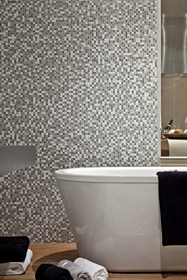 Esse modelo é composto por pastilhas de mármore e pastilhas de vidro, misturadas aleatoriamente, resultando em projetos únicos.